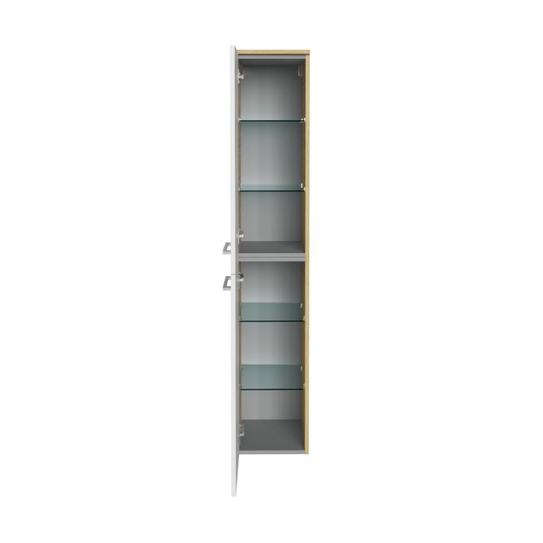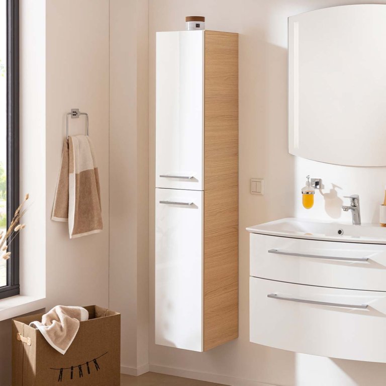Iščete visoko kopalniško omarico z veliko prostora za shranjevanje, ki se popolnoma prilega večjim in manjšim kopalnicam? Potem je nova dvodelna kopalniška omarica iz serije B.STYLE znamke Fackelmann prava izbira za vas! Omara je v elegantnem dekorju Sandeiche z belimi vrati ter je široka 30 cm, zato ponuja prostorno notranjost, ne da bi pri tem v vaši kopalnici zavzela veliko prostora. Nežen, svetel ton lesa s sivim hrbtiščem in kromiranimi ročaji ustvarja sodoben, skandinavski videz, ki bo navdušil vse ljubitelje minimalističnega pohištva. Za urejeno notranjost poskrbijo štiri steklene police, ki omogočajo dobro organizacijo in shranjevanje vseh kopalniških pripomočkov. Mehko zapiranje vrat s pomočjo kakovostnih blažilcev zagotavlja udobno uporabo brez hrupa. Zahvaljujoč dvodelni konstrukciji in temu, da je dostavljena že sestavljena, je omarica hitro pripravljena za montažo in bo brez težav našla svoje mesto v vaši kopalnici. Kakovost »Made in Germany« zagotavlja dolgo življenjsko dobo in visoko natančnost izdelave.