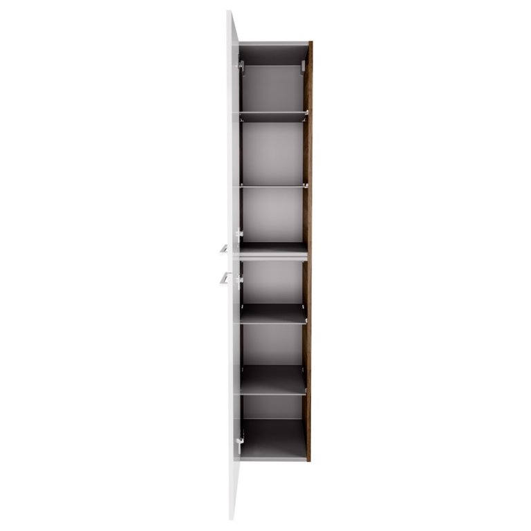 Želite več redu in organizacije v svoji kopalnici? Visoka kopalniška omarica iz serije VERONA z levim odpiranjem vrat ponuja veliko prostora za shranjevanje in navdušuje z elegantno ter brezčasno zasnovo. S širino 30 cm se lepo prilega tudi manjšim kopalnicam, hkrati pa ima presenetljivo prostorno notranjost. Štiri steklene notranje police poskrbijo za jasno razporeditev in omogočajo urejeno shranjevanje vseh kopalniških pripomočkov. Vrata s kromiranim kovinskim ročajem se mehko zapirajo, zahvaljujoč se sistemu soft-close. Ohišje v dekorju oreh z izrazito strukturo lesa skupaj z belimi vrati ustvarja prefinjen kontrast, ki v prostor vnese občutek topline. Fackelmann kopalniško pohištvo je izdelano v Nemčiji. Visoka omarica VERONA je dostavljena že sestavljena, tako da je montaža hitra (material za pritrditev na steno je priložen).