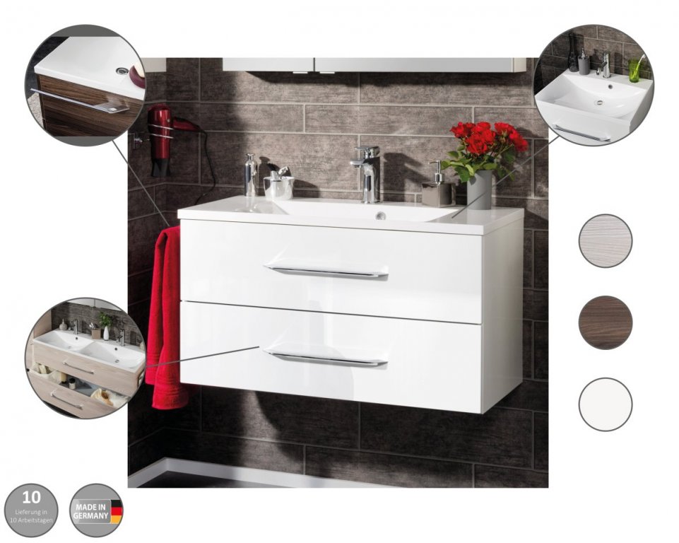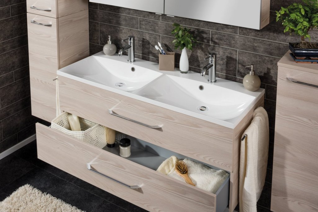 Set kopalniškega pohištva B.clever znamke Fackelmann združuje omarico za umivalnik in umivalnik ter je idealna izbira za sodobno kopalnico. Z dvema umivalnikoma je idealen za večje kopalnice in za družine. Ohišje in fronta omarice v Alaska Esche barvi ustvarjata prefinjen in eleganten videz.