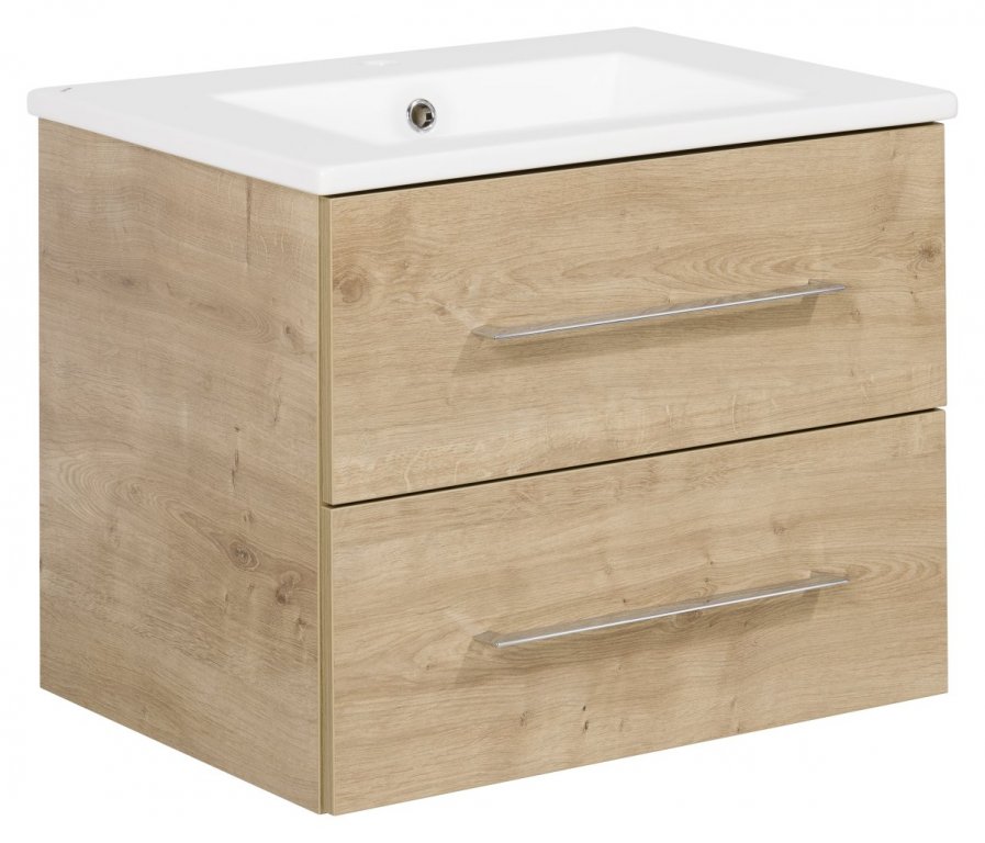 Ta dvodelni komplet kopalniškega pohištva znamke Fackelmann združuje umivalnik in omarico za umivalnik ter je del priljubljene serije B.perfekt. Ohišje in sprednja stran omarice v svetli hrast barvi posnemata naravno strukturo lesa, kar kopalnici daje topel in naraven videz. Elegantno oblikovan beli keramični umivalnik ustvari harmoničen vizualni učinek z omarico.