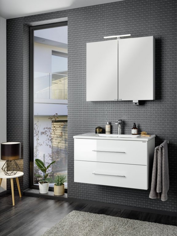 S širino 82 cm je komplet primeren za večje kopalnice. Omarica je opremljena z dvema predaloma, ki ponujata veliko prostora za shranjevanje, sistem mehkega zapiranja pa zagotavlja tiho in gladko zapiranje. Komplet je izdelan v Nemčiji z natančno pozornostjo do detajlov in je dobavljen v ploščati embalaži z jasnim in enostavnim priročnikom za montažo.