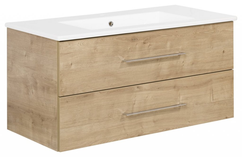 Svetlo rjava hrast barva v prostor vnese toplino ter občutek domačnosti. Ergonomsko oblikovani, polirani kromirani ročaji omogočajo udobno in enostavno odpiranje, dva prostorna predala pa ponujata dovolj prostora za shranjevanje vseh kopalniških pripomočkov.