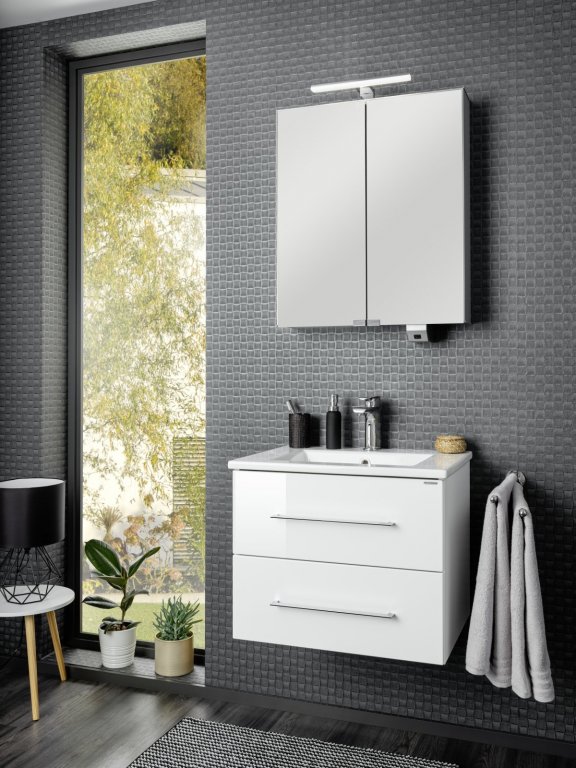S širino 62 cm je komplet idealen za manjše kopalnice ali sodobna stranišča za goste. Omarica je opremljena z dvema predaloma, ki ponujata veliko prostora za shranjevanje, sistem mehkega zapiranja pa zagotavlja tiho in gladko zapiranje. Komplet je kakovostno izdelan v Nemčiji z natančno pozornostjo do detajlov, dobavljen pa v ploščati embalaži z jasnim in enostavnim priročnikom za montažo.