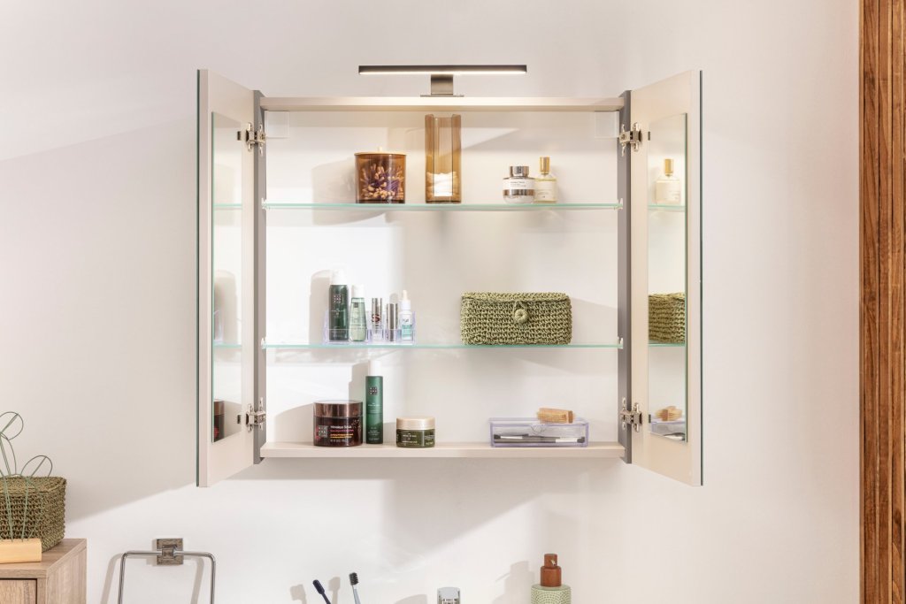 Ogledalo z omarico Fackelmann COMPACT LINE širine 70 cm združuje sodoben dizajn in praktično uporabo. Dvoje zrcalnih vrat z notranjima ogledaloma omogoča popoln pregled pri vsakodnevni negi, dve stekleni polici pa poskrbita za urejeno shranjevanje kopalniških pripomočkov. Elegantna Sonoma-Eiche površina se odlično ujema z omaricami iz iste serije ter ustvarja harmoničen videz kopalnice.