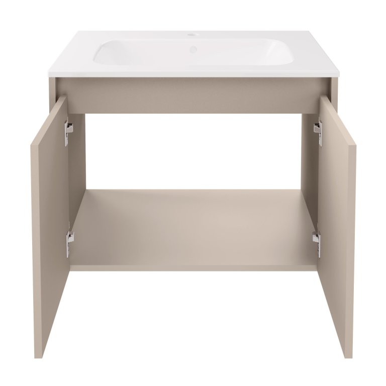 Dvodelni komplet Fackelmann Compact Line v elegantni Kaschmir barvi ponuja veliko prostora za shranjevanje in sodoben videz kopalnice. Omarica za umivalnik širine 70 cm z dvoje vrat in mehkim zapiranjem omogoča urejeno shranjevanje kopalniških pripomočkov. Zamenljivi ročaji omogočajo prilagoditev videza, globok keramični umivalnik (71 cm) pa zagotavlja udobno in praktično vsakodnevno uporabo.