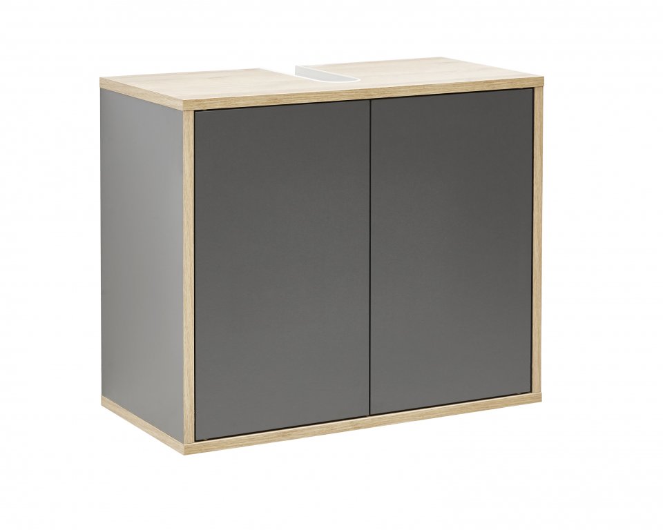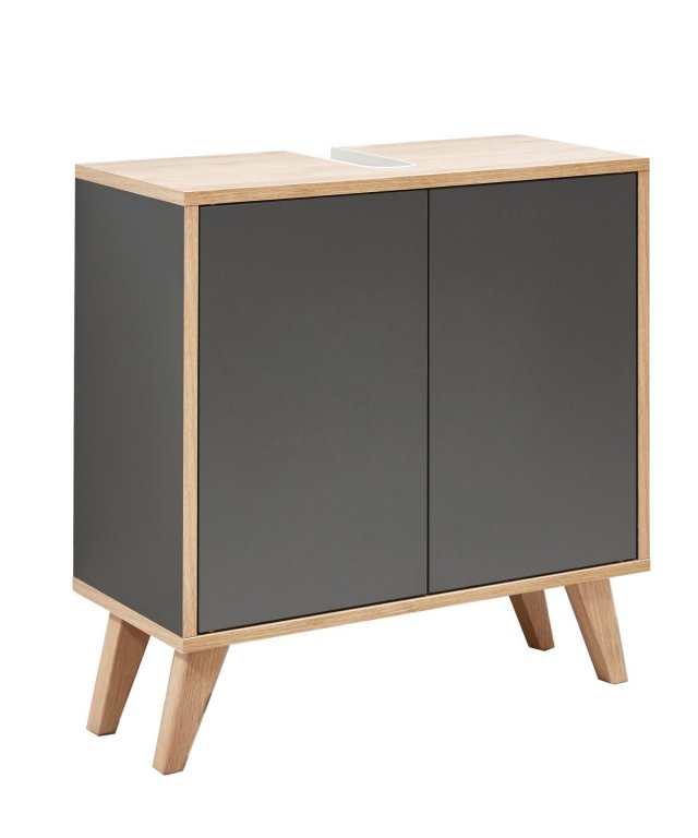 Omarica za umivalnik Finn 60 cm znamke Fackelmann v retro slogu združuje praktičen prostor za shranjevanje in izjemen dizajn, idealna za majhne kopalnice ali stranišča za goste. Dvoje vrat se odpirajo in zapirajo z rahlim dotikom s tehnologijo push-to-open. Mat Antracit ohišje in fronta ter okvir v videzu hrasta dajejo omarici edinstven in privlačen videz.