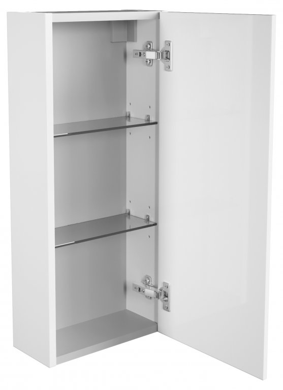 Vrata z dvostranskimi tečaji in mehkim zapiranjem zagotavljajo tiho in gladko zapiranje. V notranjosti sta dve stekleni polici za urejeno shranjevanje. Omarica je dobavljena v ploskem pakiranju z navodili za montažo. Izdelano v Nemčiji.