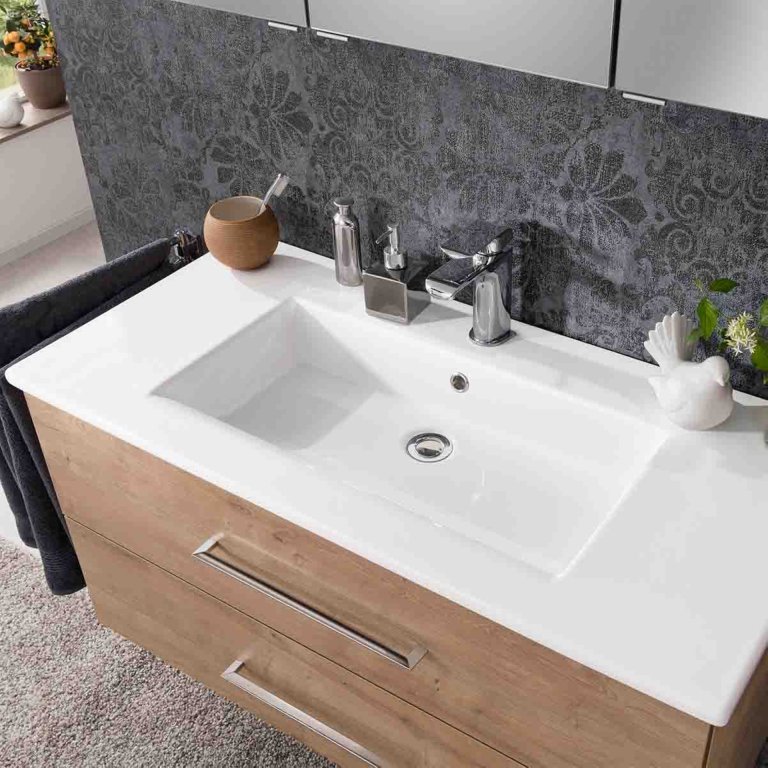 Svetlo rjava Ast-Eiche barva sledi aktualnim trendom naravnih materialov in v prostor vnese toplino ter eleganco. Omarica z umivalnikom ponuja dva prostorna predala z mehkim zapiranjem in kromiranimi ročaji, ki zagotavljajo dovolj prostora za shranjevanje kopalniških potrebščin. Kakovosten keramični umivalnik se popolnoma prilega omarici, dodatne police ob strani pa omogočajo hiter dostop do vsakodnevnih izdelkov za nego.