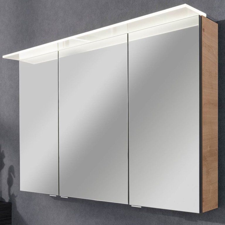 Posebno noto sestu daje moderna omarica z ogledalom z vgrajeno LED-osvetlitvijo iz akrilnega stekla, ki poskrbi za prijetno nevtralno belo svetlobo. Ob odprtju vrat se razkrijejo notranja ogledala, katera ustvarijo 3D-učinek in omogočajo 180-stopinjski pogled – idealno za vsakodnevno nego. Vgrajena vtičnica in stikalo dodatno povečujeta funkcionalnost.