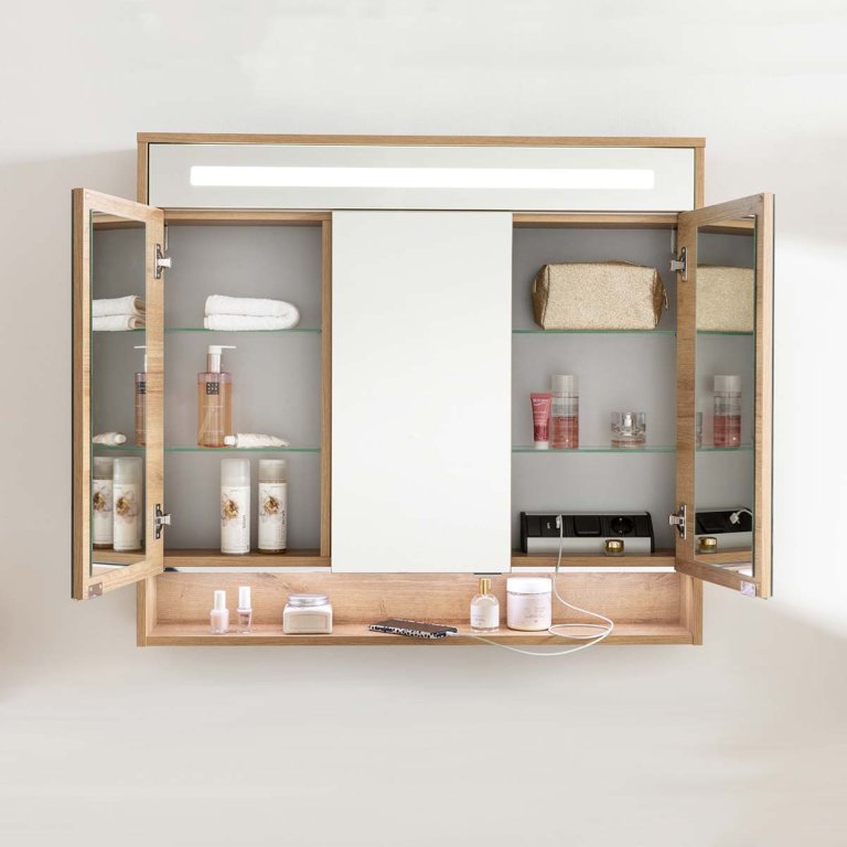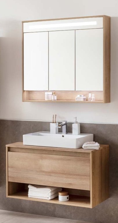 Omarica za umivalnik ponuja prostoren predal z mehkim zapiranjem ter dodatno odprto polico, ki omogoča hiter dostop do vsakodnevnih predmetov, kot so brisače ali kozmetika. Velika omarica z ogledalom pa navdušuje z naprednimi funkcijami – LED-osvetlitvijo, notranjimi ogledali za 3D-učinek in vgrajenimi USB-priključki ter vtičnico za maksimalno udobje pri uporabi.