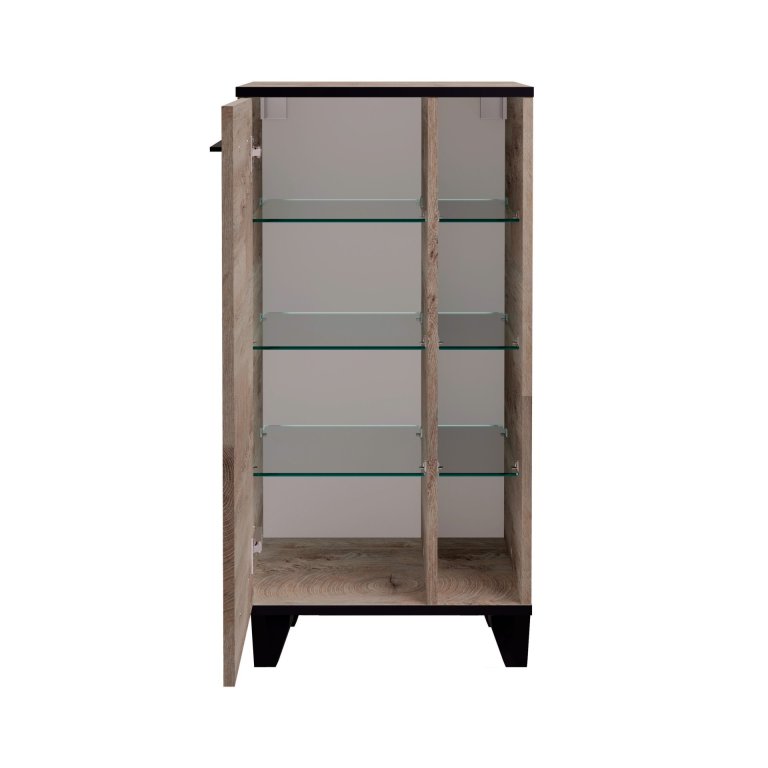 Značilnosti: 1 vrata, 3 steklene police za vrati, odprt del s steklenimi policami, zgornja plošča, 4 nogice (višina 10 cm), mat črni robovi