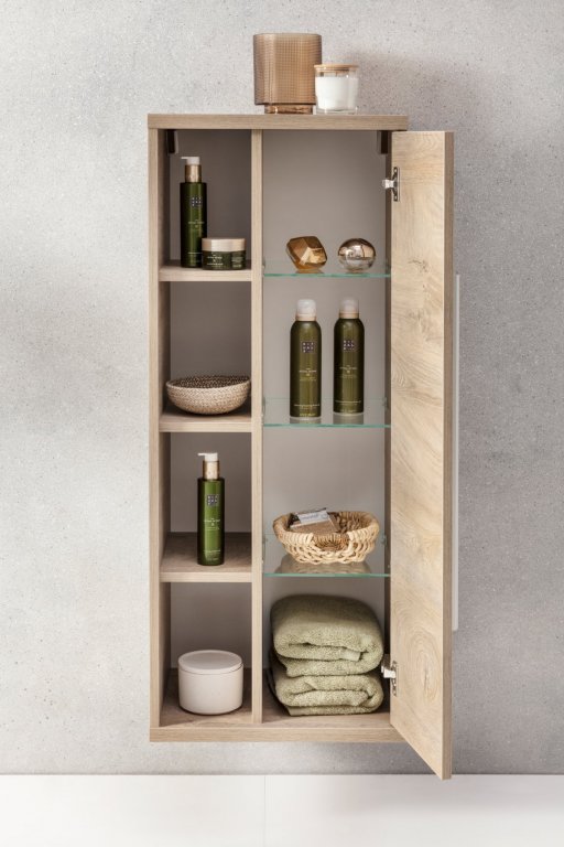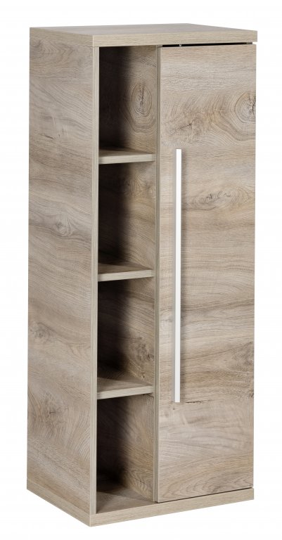 Midi omara iz serije STANFORD z odprtim regalom predstavlja estetsko dovršen in praktičen dodatek za vsako sodobno kopalnico. Zahvaljujoč možnosti dekoracije odprtih polic lahko omarico popolnoma prilagodite svojemu slogu in ustvarite edinstven kos pohištva. Dekor Nature Oak poudarja naraven značaj omarice, medtem ko srebrni ročaj doda moderen pridih. Vrata z desnim odpiranjem in mehkim zapiranjem (Soft-Close sistem) omogočajo tiho uporabo, tri steklene notranje police pa zagotavljajo dovolj prostora za urejeno shranjevanje. Dodatne tri odprte police so idealne za dekorativne ali pogosto uporabljene predmete. Omarica je izdelana v Nemčiji z veliko pozornostjo do detajlov in dostavljena že sestavljena – za hitro in brezskrbno montažo v vašo kopalnico.