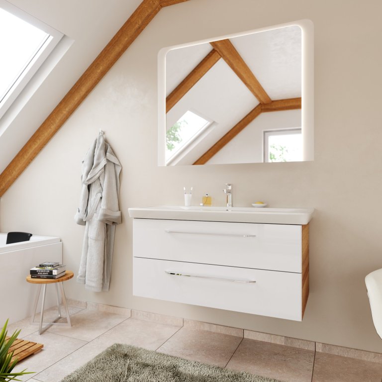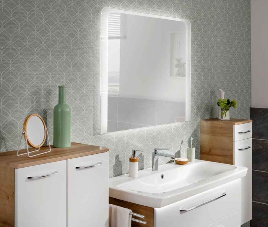 LED ogledalo Fackelmann Milano, 100 cm dopolnjuje serijo kopalniškega pohištva Milano z elegantnim in brezčasnim dizajnom. Vgrajena, zamenljiva LED-osvetlitev v hladno beli barvi zagotavlja enakomerno svetlobo, satenasta obdelava na levem, desnem in zgornjem robu pa ustvarja moderen in izrazit videz. Zaradi nevtralne oblike se ogledalo odlično kombinira z vsemi serijami kopalniškega pohištva Fackelmann.