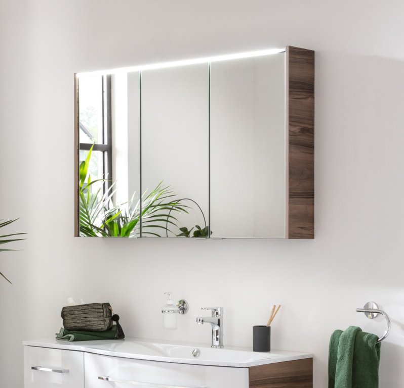 Vse kar potrebujete od vrhunske kopalniške omarice z ogledalom – in še več! Stilsko oblikovano ogledalo z omarico Fackelmann iz serije VERONA v dekorju oreh združuje funkcionalnost, prefinjen dizajn in najnovejšo tehnologijo. Tri vratca z ogledali in stranskimi robovi v Alu imitaciji ustvarjajo eleganten videz, medtem ko notranja ogledala omogočajo natančno urejanje, saj ustvarijo 3D učinek. LED osvetlitev (1320 lm, 6000 K) poskrbi za naravno svetlobo, idealno za vsakodnevno nego. Za organizacijo poskrbi notranjost z jasno razporeditvijo: štiri steklene police, električna omarica s stikalom in vtičnico za enostavno polnjenje električne zobne ščetke ali brivnika ter mehko zapiranje vrat (soft-close sistem). Ohišje v dekorju oreh se popolnoma ujema z drugimi elementi serije VERONA. Omarica je dostavljena že sestavljena in pripravljena za hitro montažo – izdelana s pozornostjo do detajlov v Nemčiji.