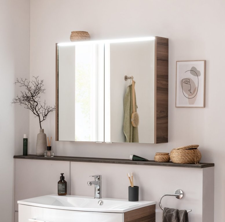 Ogledalo z omarico Fackelmann iz serije VERONA s širino 80 cm, združuje sodobno funkcionalnost z naravnim videzom – in še več! Ko odprete vrata, se razkrije pametno organizirana notranjost. Dve stekleni polici omogočata praktično razporeditev kopalniških pripomočkov. Notranja ogledala na obeh vratih med urejanjem ustvarijo 3D učinek. Zamenljiva LED osvetlitev poskrbi za odlično in dolgotrajno osvetljenost. Vgrajena električna omarica omogoča elegantno polnjenje električnega brivnika, električne zobne ščetke ali drugih naprav. Ohišje LED omarice v dekorju oreh se popolno ujema s pohištvom iz serije VERONA. Kopalniško pohištvo Fackelmann je izdelano v Nemčiji z veliko pozornostjo do detajlov. Fackelmann VERONA LED ogledalo z omarico je dostavljeno že sestavljeno in ga je mogoče hitro in enostavno umestiti v vašo novo kopalnico.