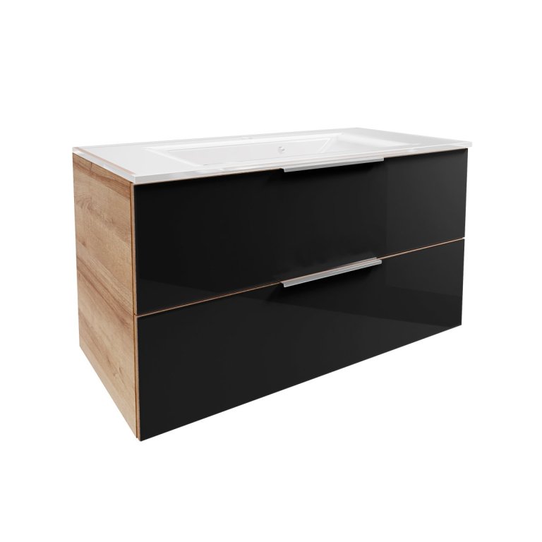 Dvodelni komplet Fackelmann B.Brillant širine 100 cm prinaša razkošen sijaj v vašo kopalnico. Omarica z Antracit visokosijajno stekleno fronto in okvirjem v Ast-Eiche barvi ustvarja eleganten kontrast, dva prostorna predala z mehkim zapiranjem pa nudita veliko prostora za shranjevanje. Bel stekleni umivalnik dopolnjuje sodoben videz in omogoča tudi dodatno osvetlitev s senzorjem gibanja (na voljo posebej - artikel 86303).