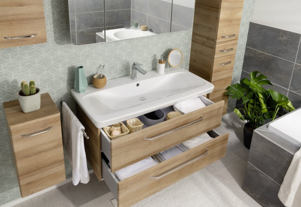 Primerna je za večje kopalnice in družine. Ujemajoči se keramični umivalnik (št. artikla 84210) ni priložen in je na voljo za nakup ločeno. Omarica je dobavljena v ploskem pakiranju z navodili za montažo. Izdelano v Nemčiji.