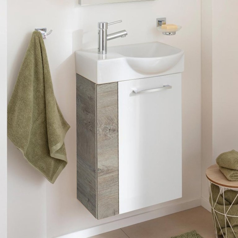 Omarica pod umivalnikom znamke Fackelmann v Nature-Oak barvi z vrati v sijaj Beli ustvarja resnično prijetno vzdušje. S širino 44 cm je ta kopalniška omarica zelo ozka, zato je idealna za majhne kopalnice in stranišča za goste. Težave s prostorom v majhnih kopalnicah so zdaj stvar preteklosti, saj omarica za umivalnik optimalno izkorišča razpoložljiv prostor pod umivalnikom in ponuja prostor za shranjevanje toaletnih potrebščin in dodatkov na polici. Omarica ima vrata z desnim tečajem. Na voljo so keramični umivalnik (št. artikla 82390) ali steklen (št. artikla 82397 in 82407), ki sedeta na omarico.