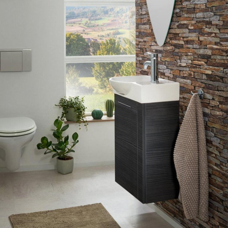 Omarica pod umivalnikom znamke Fackelmann v Dark-Oak barvi ustvarja resnično prijetno vzdušje. S širino 44 cm je ta kopalniška omarica zelo ozka, zato je idealna za majhne kopalnice in stranišča za goste. Težave s prostorom v majhnih kopalnicah so zdaj stvar preteklosti, saj omarica za umivalnik optimalno izkorišča razpoložljiv prostor pod umivalnikom in ponuja prostor za shranjevanje toaletnih potrebščin in dodatkov na polici. Omarica ima vrata z levim tečajem. Na voljo so keramični umivalnik (št. artikla 82390) ali steklen (št. artikla 82397 in 82407), ki sedeta na omarico.