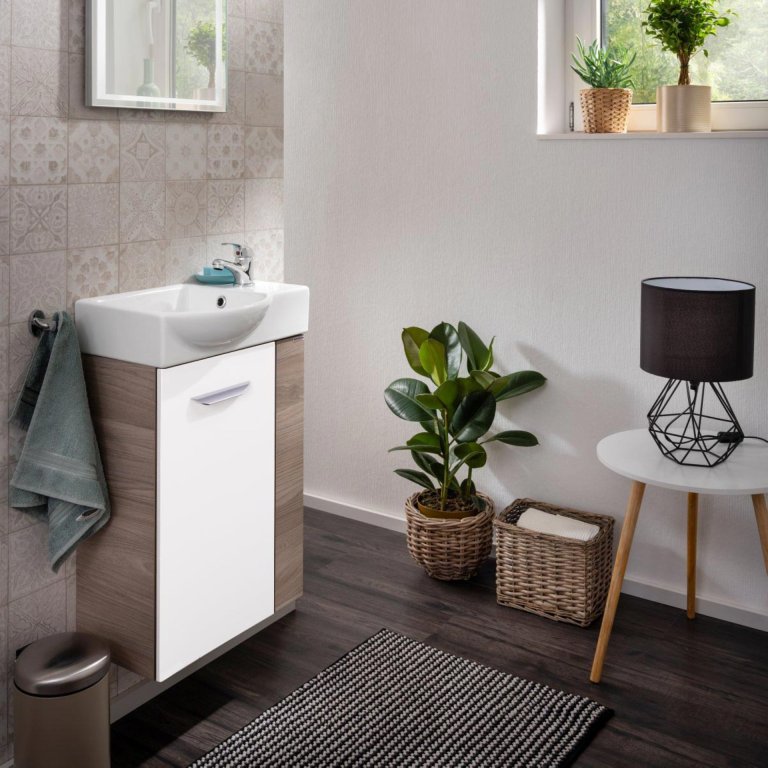 Omarica pod umivalnikom znamke Fackelmann v Steinesche barvi z vrati v sijaj Beli ustvarja resnično prijetno vzdušje. S širino 44 cm je ta kopalniška omarica zelo ozka, zato je idealna za majhne kopalnice in stranišča za goste. Težave s prostorom v majhnih kopalnicah so zdaj stvar preteklosti, saj omarica za umivalnik optimalno izkorišča razpoložljiv prostor pod umivalnikom in ponuja prostor za shranjevanje toaletnih potrebščin in dodatkov na polici. Omarica ima vrata z levim tečajem. Na voljo so keramični umivalnik (št. artikla 82390) ali steklen (št. artikla 82397 in 82407), ki sedeta na omarico.