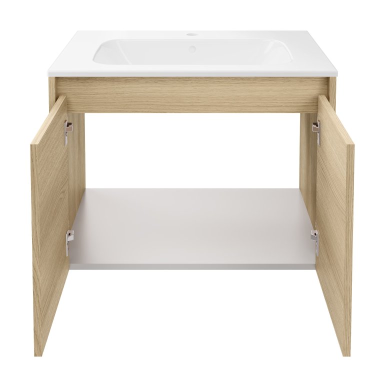 Dvodelni komplet Fackelmann Compact Line v elegantni Lindberg-Eiche barvi ponuja veliko prostora za shranjevanje in sodoben videz kopalnice. Omarica za umivalnik širine 70 cm z dvoje vrat in mehkim zapiranjem omogoča urejeno shranjevanje kopalniških pripomočkov. Zamenljivi ročaji omogočajo prilagoditev videza, globok keramični umivalnik (71 cm) pa zagotavlja udobno in praktično vsakodnevno uporabo.
