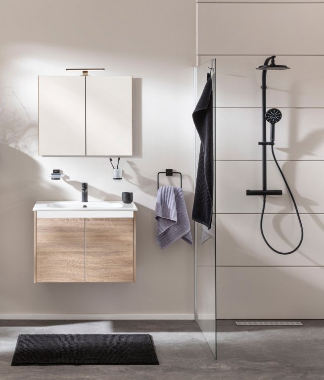 Dvodelni komplet Fackelmann Compact Line v elegantni Sonoma-Eiche barvi ponuja veliko prostora za shranjevanje in sodoben videz kopalnice. Omarica za umivalnik širine 70 cm z dvoje vrat in mehkim zapiranjem omogoča urejeno shranjevanje kopalniških pripomočkov. Zamenljivi ročaji omogočajo prilagoditev videza, globok keramični umivalnik (71 cm) pa zagotavlja udobno in praktično vsakodnevno uporabo.