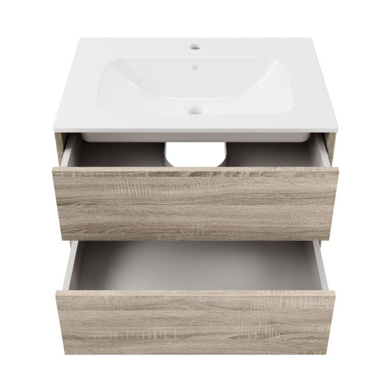 Dvodelni set Fackelmann Compact Line v Sonoma-Eiche barvi prinaša eleganco in funkcionalnost v vašo kopalnico. Omarica za umivalnik širine 70 cm z dvema predaloma in mehkim zapiranjem omogoča urejeno shranjevanje, zamenljivi ročaji pa omogočajo prilagoditev stilu vaše kopalnice. Globok keramični umivalnik (71 cm) zagotavlja praktičnost pri vsakodnevni uporabi, hkrati pa dopolnjuje sodoben, minimalističen dizajn.