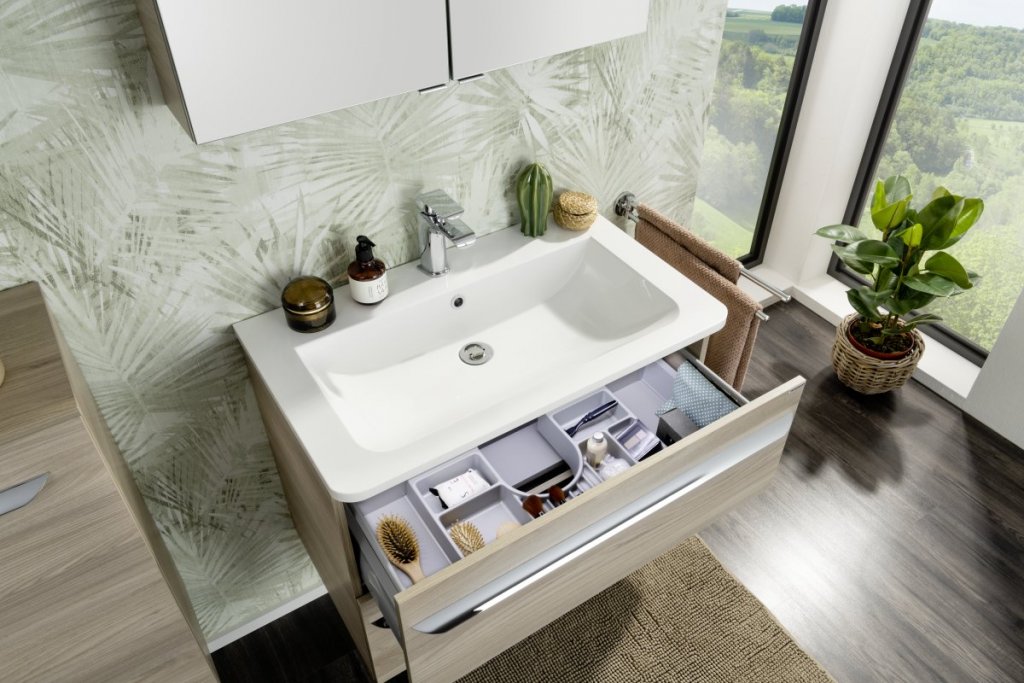 Naravna estetika v kombinaciji s funkcionalnim dizajnom – to je Fackelmann linija LUXOR. Omara pod umivalnikom širine 80 cm v toplem lesnem dekorju srebrno sive barve prinaša domačo atmosfero v vsako sodobno kopalnico. S svojo širino in pametno razporeditvijo prostora je idealna izbira za večje ali družinske kopalnice. Dva prostorna predala s sistemom Soft-Close zagotavljata tiho in nežno zapiranje, medtem ko organizator v zgornjem predalu omogoča optimalno urejenost manjših kopalniških pripomočkov. Notranjost predalov je v elegantni srebrno sivi barvi, kar prispeva k elegantnemu videzu. Popolna kombinacija: omarica je idealno usklajena z umivalnikom iz litega marmorja (Art. št. 79800), ki ga je možno naročiti posebaj. Po želji lahko osnovno širino 80 cm razširite z dodatnima 20 cm stranskima omaricama iz serije LUXOR in ustvarite enoto širine 120 cm. Element je izdelan v Nemčiji in je dostavljen že sestavljen, kar zagotavlja hitro in enostavno montažo v vašo kopalnico.