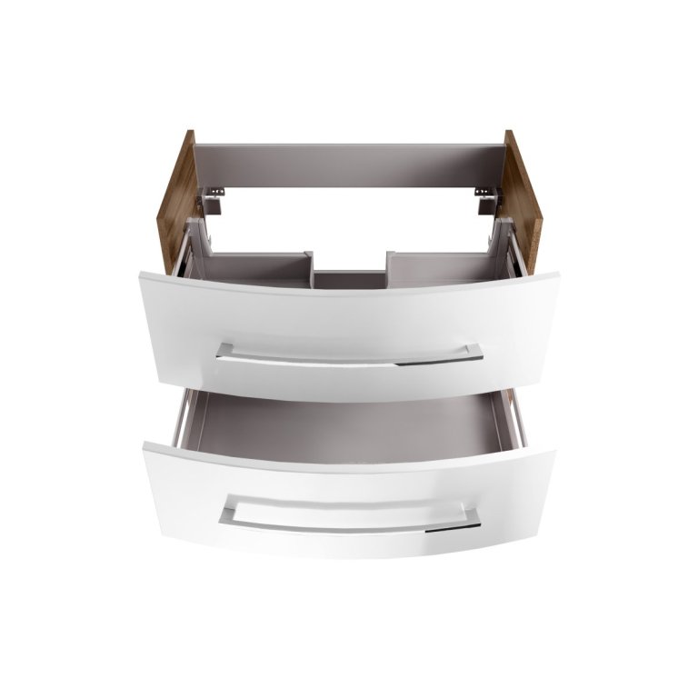 Z nežno zaobljenimi predali se omarica VERONA s širino 79,4 cm popolnoma prilega dizajnu umivalnikov iz iste serije in skupaj z njimi tvori harmonično celoto. Kromirana ročaja predstavljata eleganten dodatek temnemu ohišju v dekorju oreh in skupaj z njim ustvarjajo sofisticiran kontrast. Predala s sistemom mehkega zapiranja sta dovolj prostorna za organizacijo vseh vaših kopalniških pripomočkov – tako bodo ti vedno pri roki, kopalnica pa bo ostala urejena in estetska. Omarica se odlično ujema s steklenim umivalnikom (artik. št. 73609) ali z umivalnikom iz litega marmorja (artik. št. 73600), ki ju je mogoče naročiti posebej. Kopalniško pohištvo Fackelmann je zasnovano in izdelano v Nemčiji z izjemno pozornostjo do detajlov. Omarica pod umivalnikom VERONA je dostavljena že sestavljena, tako da je montaža hitra in enostavna. Material za montažo je priložen.
