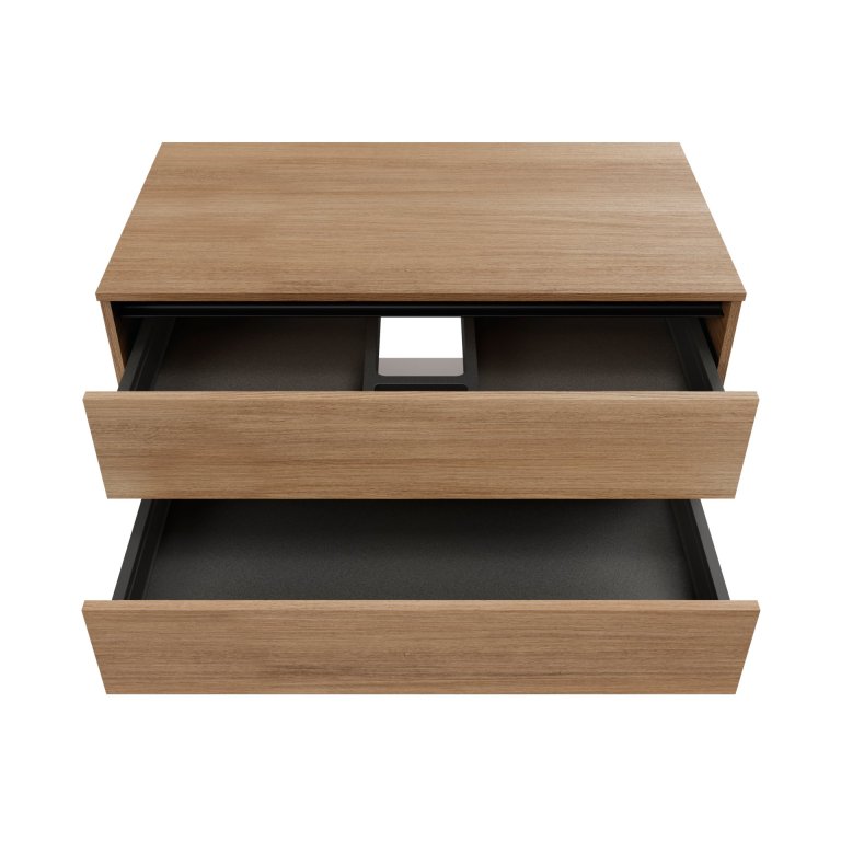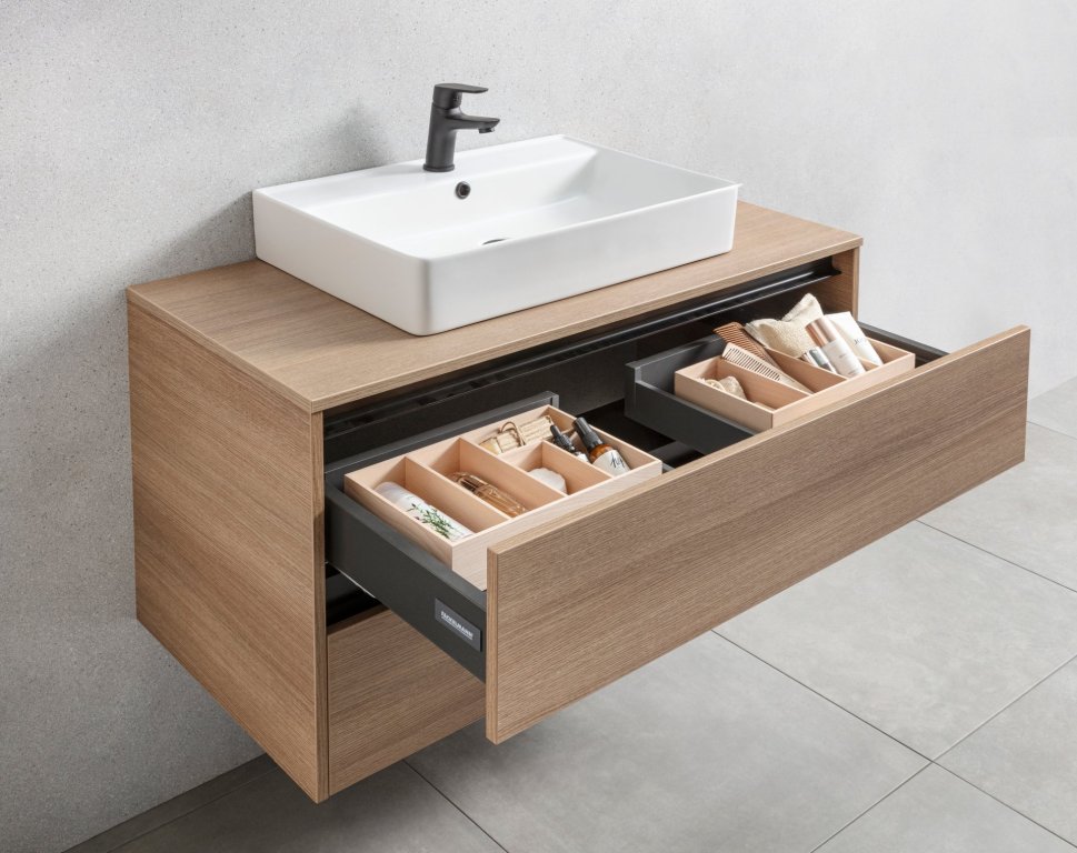 Ko se temna mat črna sreča z umirjenim dekorjem hrasta, je rezultat kopalniška omara z WOW učinkom, ki združuje funkcionalnost in prefinjen stil. Prostorna omara pod umivalnikom je popolna rešitev za vse, ki cenijo red in organizacijo. Dva izvlečna predala omogočata, da so vaše brisače, kozmetika in drugi pripomočki vedno lepo pospravljeni in pregledno organizirani. Pokrivna plošča omogoča dodatno odlagalno površino za izdelke, ki jih najpogosteje uporabljate. Dizajn brez ročajev poudari topel dekor hrasta in doda prostoru sodoben in eleganten pridih. Omara je izdelana v Nemčiji s pozornostjo do detajlov – kakovost made in Germany.