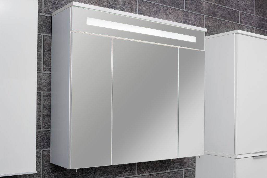 Fackelmann KARA LED omarica z ogledalom širine 80 cm združuje sodoben dizajn v dekorju Bela in premišljeno funkcionalnost. Tri ogledalne površine ustvarijo 3D-učinek za popoln pogled z več strani, šest steklenih polic pa omogoča pregledno shranjevanje kozmetike. Vgrajena LED-osvetlitev (7,35 W) zagotavlja močno in energijsko učinkovito svetlobo, mehki tečaji pa poskrbijo za tiho zapiranje vrat. Omarica ima vgrajeno električno omarico z vtičnico in stikalom, je dostavljena že sestavljena in izdelana v Nemčiji.