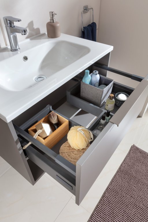 Kombinacija funkcionalnosti in sodobnega dizajna, popolna za vašo kopalnico. Dvodelni kopalniški set B.PARIS znamke Fackelmann, ki vključuje omaro pod umivalnikom in umivalnik iz litega marmorja, bo vaši kopalnici dodal brezčasno eleganco. Ohišje in predal omare sta v Cubanit sivem dekorju. Njen prostoren predal nudi obsežen prostor za shranjevanje. Poleg predala z mehkim zapiranjem ima omara tudi osvetljeno odprto spodnjo polico. Osvetlitev upravlja senzor gibanja na baterije, ki avtomatsko prižge luč ob vstopu v prostor in jo po približno 30 sekundah brez gibanja samodejno ugasne. Za lažjo organizacijo poskrbi siva zložljiva košarica iz tekstila, ki se lepo poda osvetljenemu prostoru in omogoča organizirano shranjevanje manjših kopalniških pripomočkov. Po potrebi lahko dokupite dodatne košarice. Omaro dopolnjuje umivalnik iz litega marmorja z gladko površino in izjemno odpornostjo. Set je izdelan v Nemčiji. Dostavljen je že sestavljen, kar omogoča hitro in enostavno montažo.
