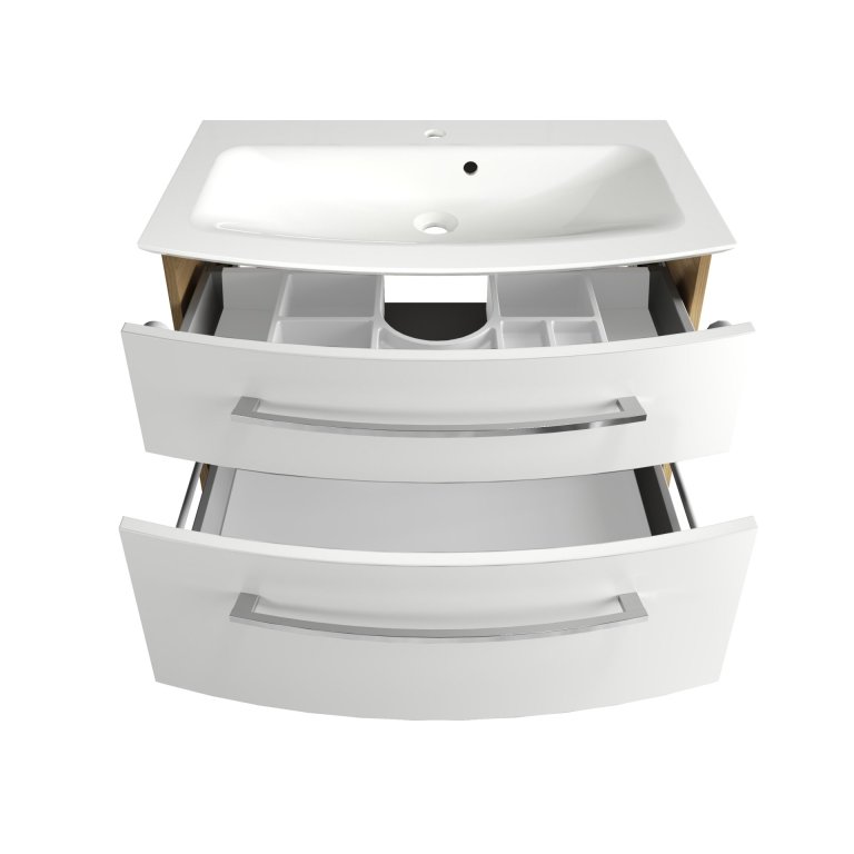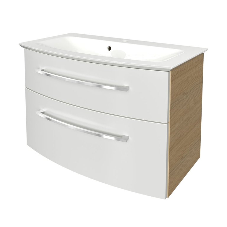 Iščete popoln umivalnik za svoj dom? Potem je 2-delni komplet iz serije B.STYLE znamke Fackelmann odlična izbira. Rahlo zaobljena predala s kromiranima ročajema dajeta kopalniški omarici pridih lahkotnosti in elegance. Dva prostorna predala z mehkim zapiranjem (Soft-Close) nudita veliko prostora za shranjevanje in s pomočjo vgrajenega pripomočka za organizacijo poskrbita za red in preglednost – vsi vaši kopalniški pripomočki bodo vedno pri roki. Moderni dekor Sandeiche z belimi vrati v vaši kopalnici ustvari toplo in trendovsko atmosfero. Umivalnik iz litega marmorja v beli barvi sledi linijam omarice in skupaj tvorita popolno celoto. Komplet je idealen tako za večje kot za manjše kopalnice. Fackelmann Kopalniško pohištvo je izdelano v Nemčiji z veliko pozornosti do detajlov in vam je na dom dostavljeno že sestavljeno, kar omogoča hitro in enostavno namestitev.