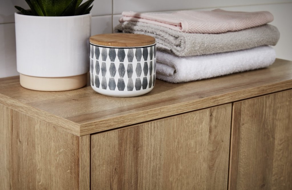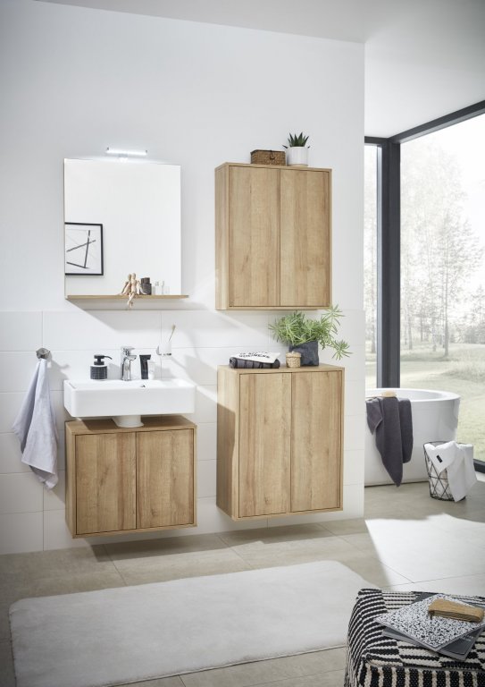 Če želite viseče pohištvo spremeniti v stoječe, lahko uporabite štiri masivne lesene nogice (št. artikla 84600) za sodoben skandinavski videz. Za priročno shranjevanje perila se priporoča tudi postavitev koša za perilo (št. artikla 84619) v notranjost omarice.