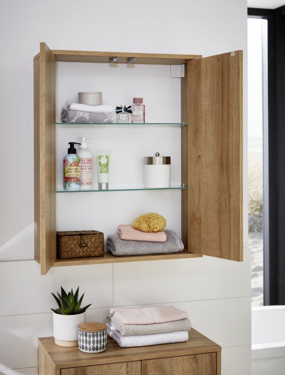Dvojna zgornja omara Finn 60 cm znamke Fackelmann v Ast Eiche barvi združuje praktičen prostor za shranjevanje in izjemen dizajn ter je idealna za majhne kopalnice ali stranišča za goste. Notranja razporeditev z dvema steklenima policama omogoča pregledno in organizirano shranjevanje kopalniških dodatkov ter kozmetike.