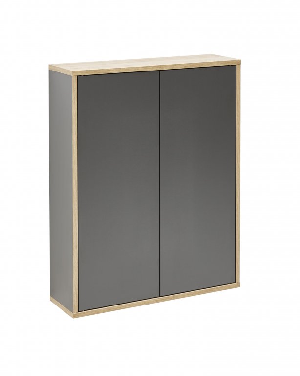 Dvojna zgornja omara Finn 60 cm znamke Fackelmann v Antracit barvi združuje retro slog in praktičen prostor za shranjevanje ter je idealna za majhne kopalnice ali stranišča za goste. Notranja razporeditev z dvema steklenima policama omogoča pregledno in organizirano shranjevanje kopalniških dodatkov ter kozmetike.