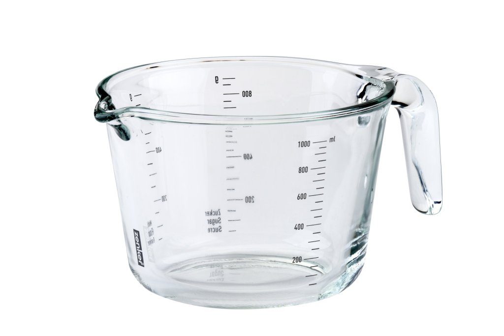 Steklen merilni lonček z ročajem znamke Zenker s kapaciteto polnenja do 1 L oz. sladkorja do 1 kg ali moke do 800 g.